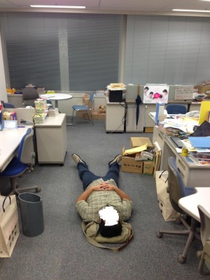 今回激写されちゃったのは、この文章を書いている私......同僚に売られてしまいました。風邪気味なのにやらなきゃいけない事があるんで無理して居残っていて、ようやく仕事を終わらせて帰るだけという状態。8階の編集部から会社の前のタクシー乗り場まで降りて行くのがキツくて、体力を回復するためにちょっと横になってみた...そんな一瞬です。なんかね、ソファーとか椅子並べるのって、背中が痛くなるんですよ。床はカーペット張りで結構やわらかいし、土足とはいえ、ウンコ踏んだ足で歩きまわってる人はさすがに居ないでしょうし、私は床派です!!(だから何だというのか?) (スピリッツ編集部)