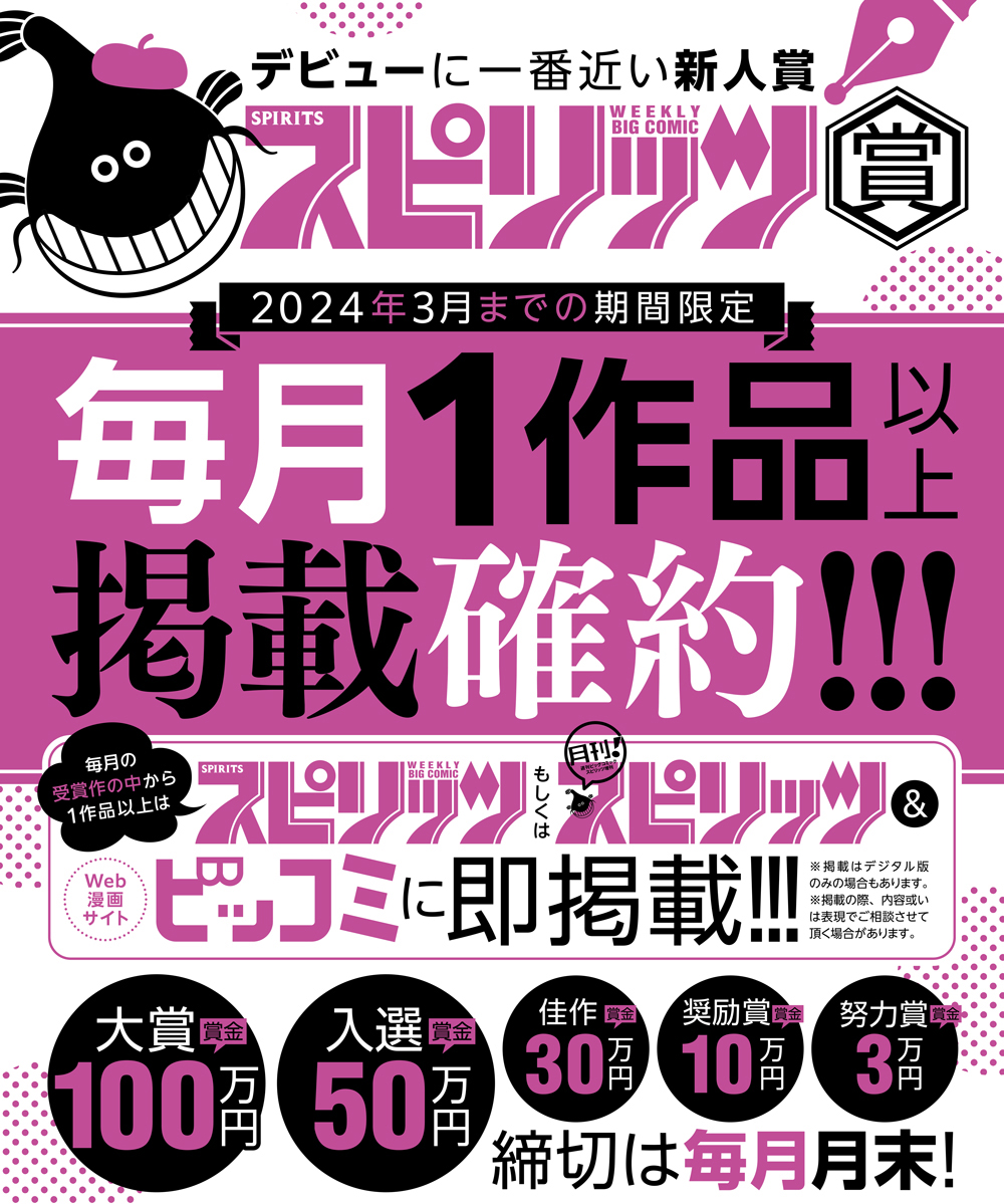 毎月の受賞作の中から1作品以上は「週刊ビッグコミックスピリッツ」もしくは「月刊!スピリッツ」&Web漫画サイト「ビッコミ」に即掲載!!!