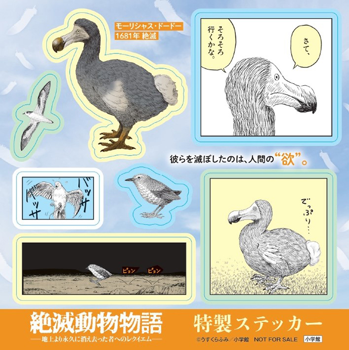 そして、『絶滅動物物語』第3集の発売を記念して、オリジナルステッカーがもらえるノベルティフェアを全国の対象書店にて開催します!1~3集で描かれた絶滅動物たちの、かわいくも切ない姿がステッカーに。ここでしか手に入らないデザインで、哀愁ただよう世界観を堪能ください!