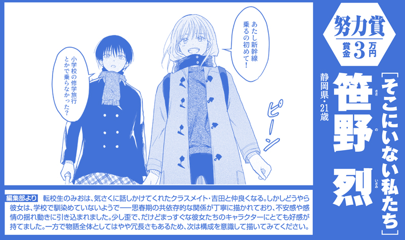 転校生のみおは、気さくに話しかけてくれたクラスメイト・吉田と仲良くなる。しかしどうやら彼女は、学校で馴染めていないようでーー思春期の共依存的な関係が丁寧に描かれており、不安感や感情の揺れ動きに引き込まれました。少し歪で、だけどまっすぐな彼女たちのキャラクターにとても好感が持てました。一方で物語全体としてはやや冗長さもあるため、次は構成を意識して描いてみてください。