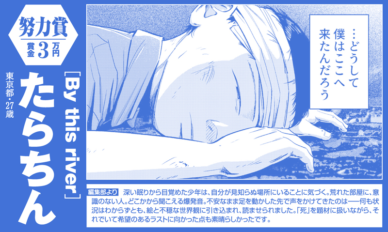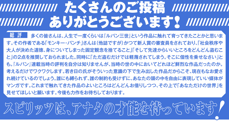 多くの皆さんは、人生で一度くらいは『ルパン三世』という作品に触れて育ってきたことかと思います。その作者である「モンキー・パンチ」さんは(他誌ですが)かつて新人賞の審査員をされており、「社会秩序や大人が決めた道徳、身についてしまった固定観念を捨てること」「そして先達からいいところをどんどん盗むこと」の2点を推奨しておられました。同時に「ただ盗むだけでは軽蔑されてしまう。そこに個性を乗せなさい」とも。『ルパン』連載当時の評判を自分は知りませんが、当時の世の中においてどれほど鮮烈な作品だったのか。考えるだけでワクワクします。若き日の氏がそういった意識の下で生み出した作品だからこそ、現在もなお愛され続けているのでしょう。誰にも縛られず、誰の制約も受けずに、あなたの頭の中を自由に表現していい媒体がマンガです。これまで触れてきた作品のよいところはどんどんお借りしつつ、その上で「あなただけの世界」を見せてほしいと願います。今後も力作をお待ちしております。