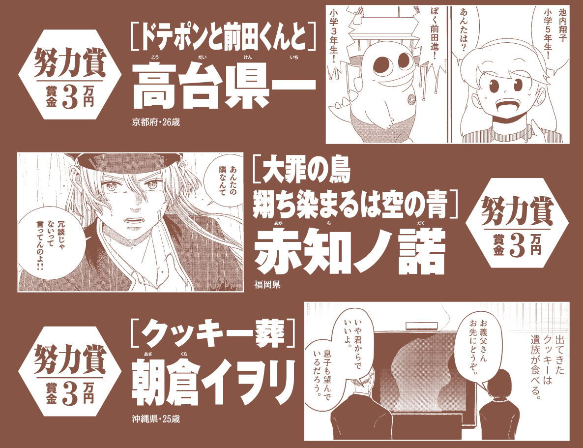 M-1などの漫才コンクールを見ていると、「つかみ」という言葉を耳にすることがたびたびあります。「つかみがよくて一気に引き込まれた」「つかみが遅くて乗り切れなかった」たとえばそんな形で使われますが、皆様は漫才におけるつかみという言葉の定義を、ぱっと答えることができますでしょうか。検索してみたところ、漫才におけるつかみとは、「ネタが始まる前の冒頭部分で客の笑いを誘い、心を掴むためのギャグやボケのこと」だそうです。多くの芸人さんがよりよいつかみを作ろうと苦心していることは、想像にかたくないと思います。さて、漫画でもつかみはとても大切です。特にエンタメが溢れている今の時代では、冒頭でしっかりつかまないと、読者は読むのをやめてしまいます。今回 受賞された4作品には、それぞれ強いつかみがありました。言い換えるとそれは、なんとかしてこの漫画を最後まで読んでもらおうという意志がありました。そういった強い意志のある作品を、今後もお待ちしております。