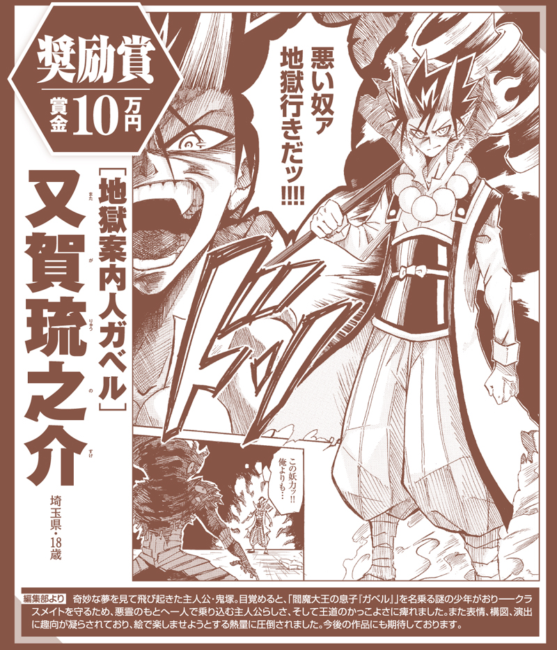 奇妙な夢を見て飛び起きた主人公・鬼塚。目覚めると、「閻魔大王の息子『ガベル』」を名乗る謎の少年がおりーークラスメイトを守るため、悪霊のもとへ一人で乗り込む主人公らしさ、そして王道のかっこよさに痺れました。また表情、構図、演出に趣向が凝らされており、絵で楽しませようとする熱量に圧倒されました。今後の作品にも期待しております。