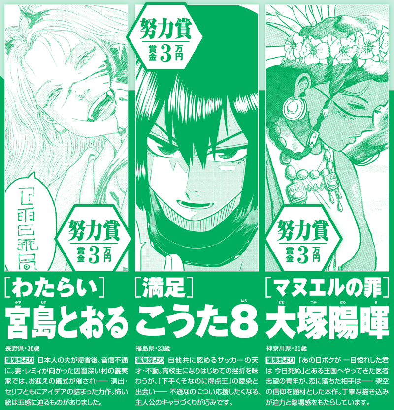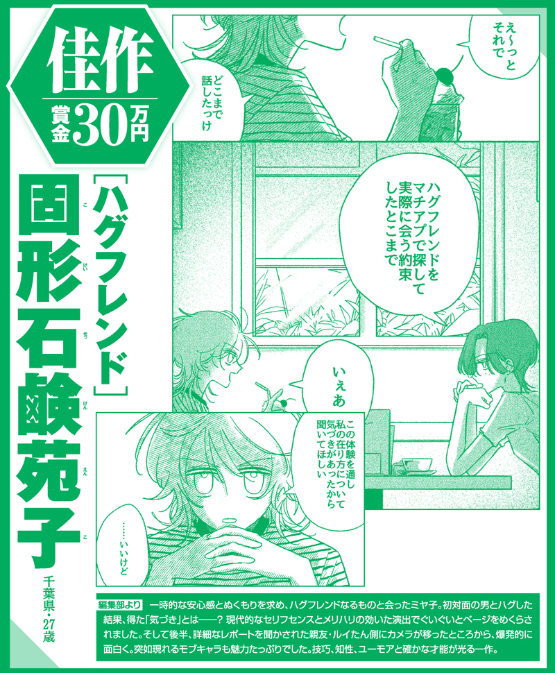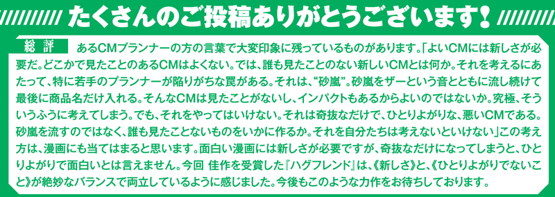 あるCMプランナーの方の言葉で大変印象に残っているものがあります。「よいCMには新しさが必要だ。どこかで見たことのあるCMはよくない。では、誰も見たことのない新しいCMとは何か。それを考えるにあたって、特に若手のプランナーが陥りがちな罠がある。それは、“砂嵐”。砂嵐をザーという音とともに流し続けて最後に商品名だけ入れる。そんなCMは見たことがないし、インパクトもあるからよいのではないか。究極、そういうふうに考えてしまう。でも、それをやってはいけない。それは奇抜なだけで、ひとりよがりな、悪いCMである。砂嵐を流すのではなく、誰も見たことないものをいかに作るか。それを自分たちは考えないといけない」この考え方は、漫画にも当てはまると思います。面白い漫画には新しさが必要ですが、奇抜なだけになってしまうと、ひとりよがりで面白いとは言えません。今回 佳作を受賞した『ハグフレンド』は、《新しさ》と、《ひとりよがりでないこと》が絶妙なバランスで両立しているように感じました。今後もこのような力作をお待ちしております。