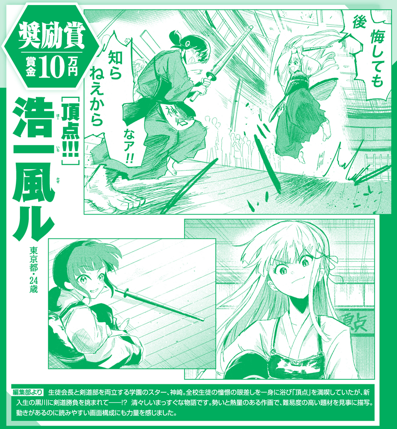 生徒会長と剣道部を両立する学園のスター、神崎。全校生徒の憧憬の眼差しを一身に浴び「頂点」を満喫していたが、新入生の黒川に剣道勝負を挑まれて――!? 清々しいまっすぐな物語です。勢いと熱量のある作画で、難易度の高い題材を見事に描写。動きがあるのに読みやすい画面構成にも力量を感じました。