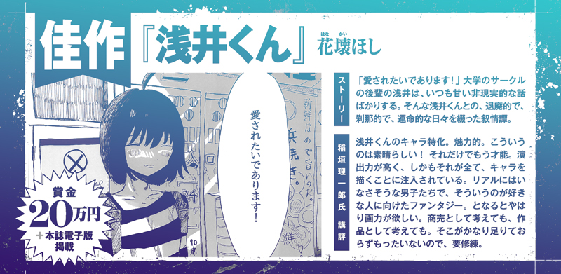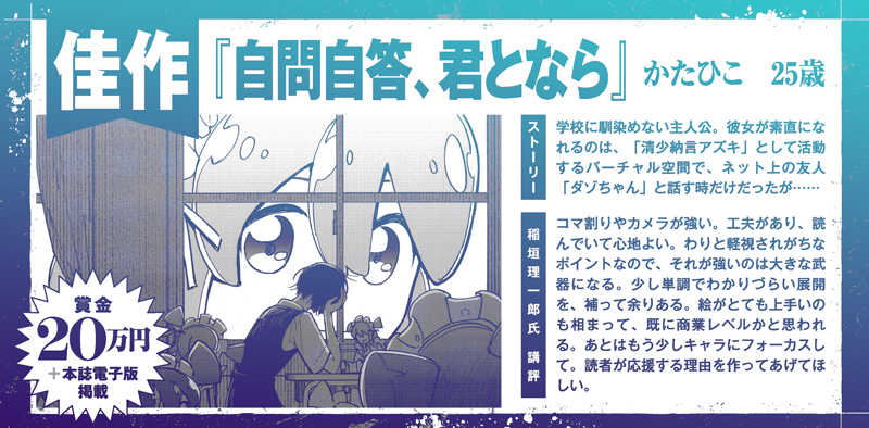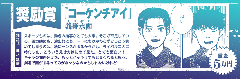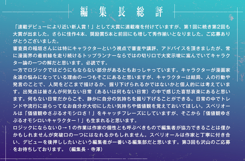 「連載デビューにより近い新人賞!」として大賞に連載権を付けていますが、第1回に続き第2回も大賞が出ました。さらに佳作4本、奨励賞5本と前回にも増して秀作揃いとなりました。ご応募ありがとうございました。