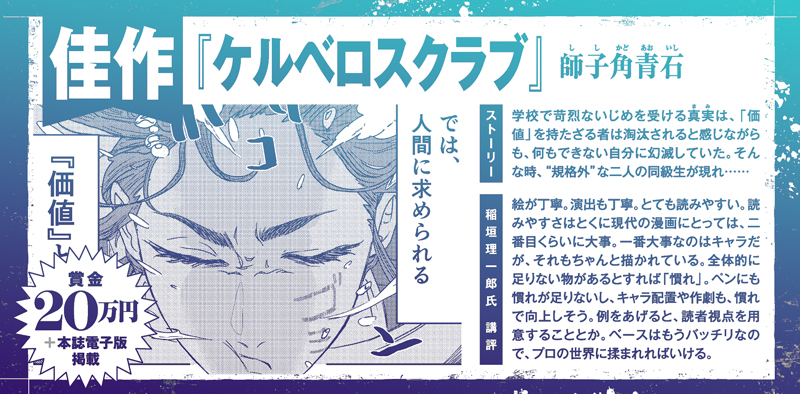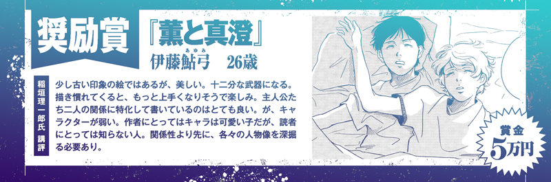 審査員の稲垣さんには特にキャラクターという視点で審査や講評、アドバイスを頂きましたが、常に漫画界の最前線を走り続けるトップランナーならではの切り口で大変示唆に富んでいてキャラクター論の一つの解だと思います。必読です。