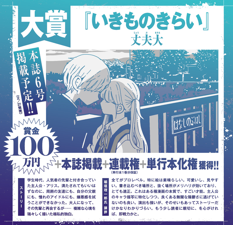 大賞 賞金100万円+本誌掲載+連載権(単行本1巻分保証)+単行本化権獲得!!